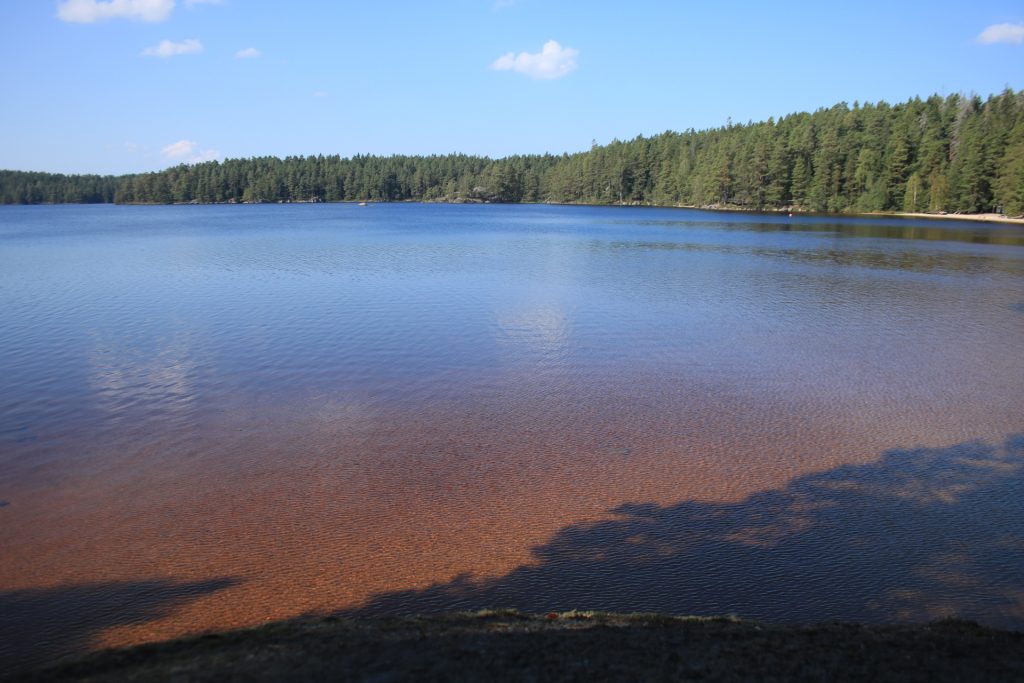 Die überwiegende Baumart ist die Kiefer. Vereinzelt gibt es Fichten und Laubbäume, wie die Buche. Der Boden ist überwachsen mit verschiedenen Moosen und – natürlich – Blau- und Preiselbeeren. Die Blaubeeren waren leider schon alle abgeerntet. Nach ca. 3 KM kamen wir an einen Badestrand, den man von einem anderen Eingang mit dem Auto erreichen kam. Dort haben wir in den Bäumen wieder Kleiber, Baumläufer und Haubenmeisen beobachten können. Als nächstes ging es zu einem riesigen Findling, dem Junker Jägares Sten. Dort haben wir zwei Landsleute aus Niedersachsen getroffen und kurz geplaudert. Wir machten uns dann auf den Rückweg. Es ging wieder über Wurzeln und Felsen. Zum Ende der Wanderung mussten wir über Treppen auf eine massive Steinwand steigen und kurz vor dem Ziel ging es dann wieder über Felsen bergab. Nach 6 Stunden erreichten wir wieder den Ausgangspunkt und fuhren zurück zum Campinglatz. Dort ließen wir dem Tag in aller Ruhe ausklingen.