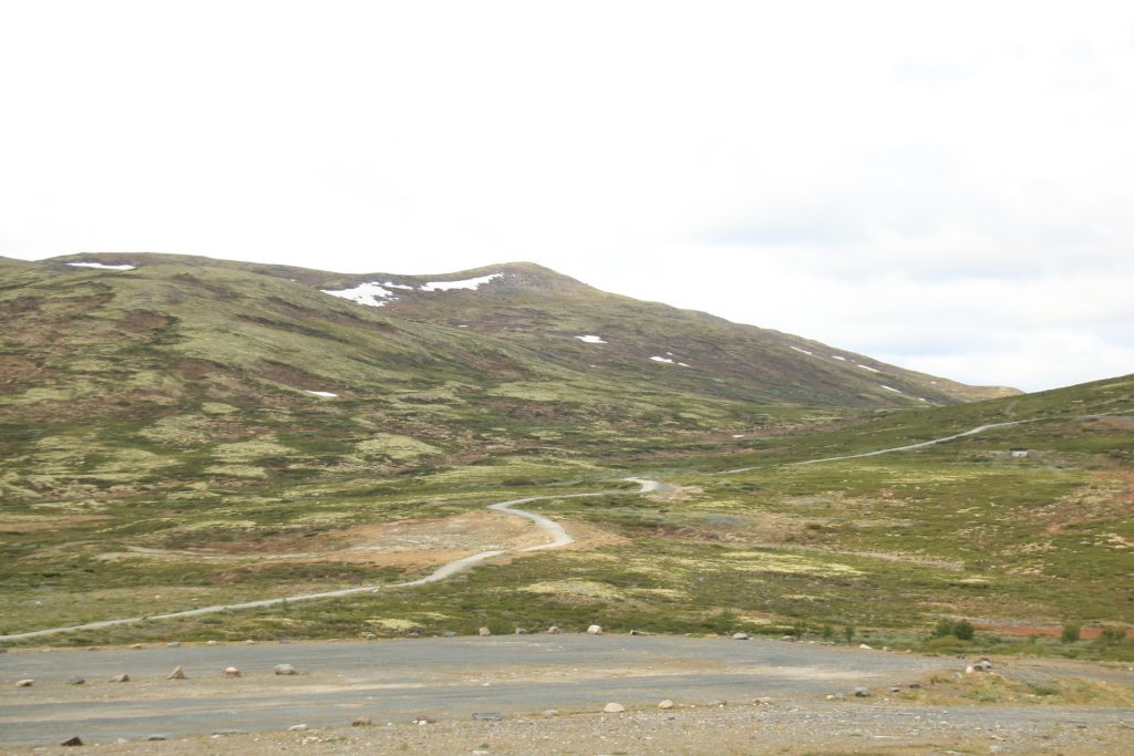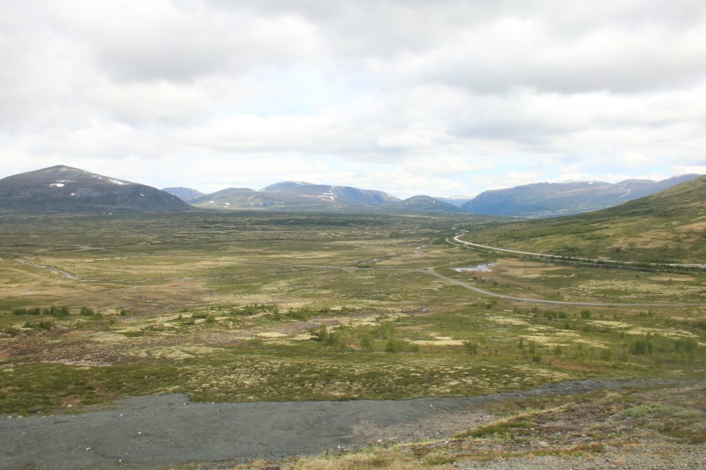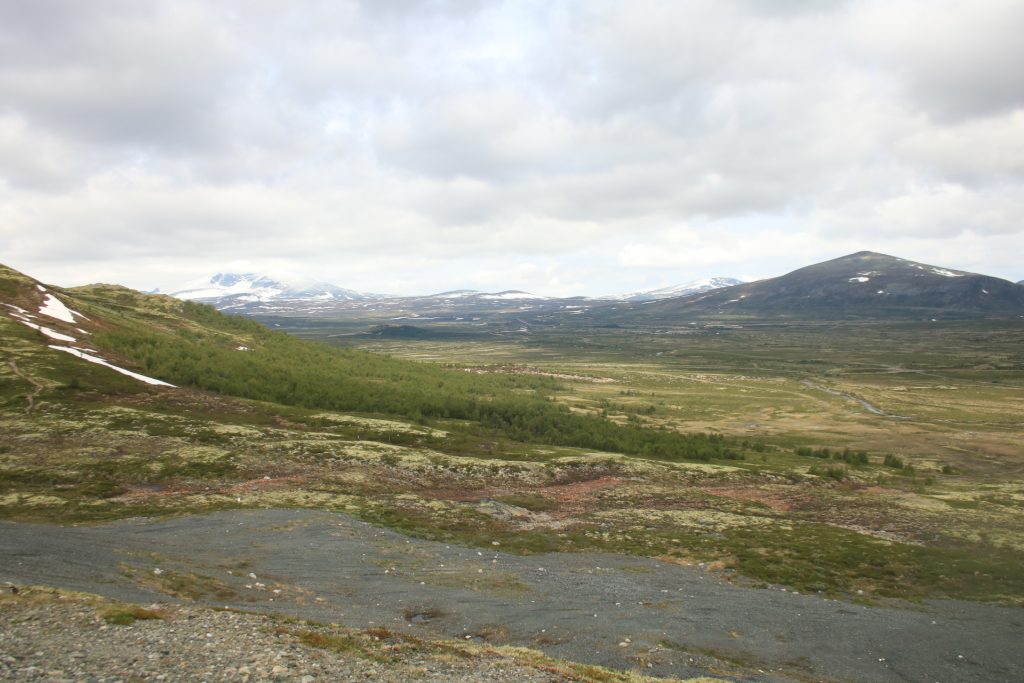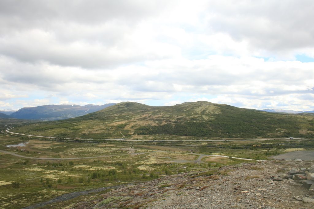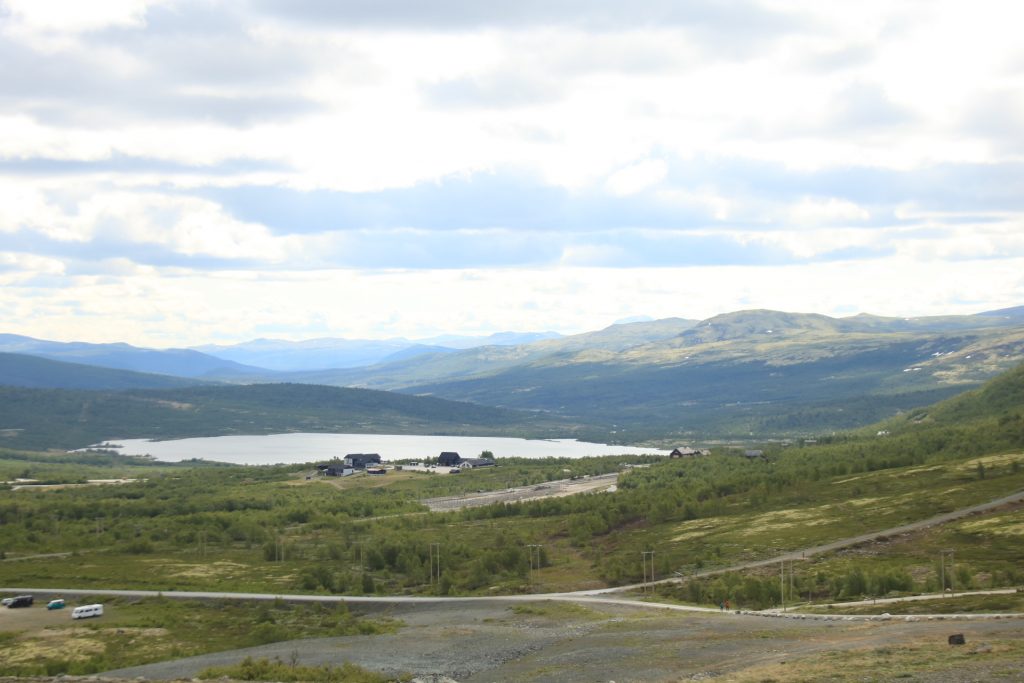 Weiter geht es nach Dombås zum ersten Kaffee. Wir wollten in die Kirche von Dombås, aber die war leider verschlossen. Weiter auf der E6 Richtung Kongsvoll Fjeldstue. Da sehen wir die nächste Elchkuh. Wir machen einen kleinen Abstecher nach Snøhetta. Oben am Snøhetta haben wir einen wirklichen fantastischen Blick zu genießen. Auf dem Parkplatz steht ein Wagen aus Deutschland mit fast identischen Kennzeichen wie unseres, nur die Zahlenfolge war anders. Die Welt ist so klein. Hier ging auch noch ein Wanderweg zu einer Hütte. Das haben wir dann aber gestrichen, weil der Winde extrem stark und eisig war.