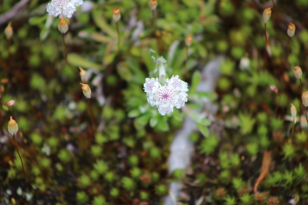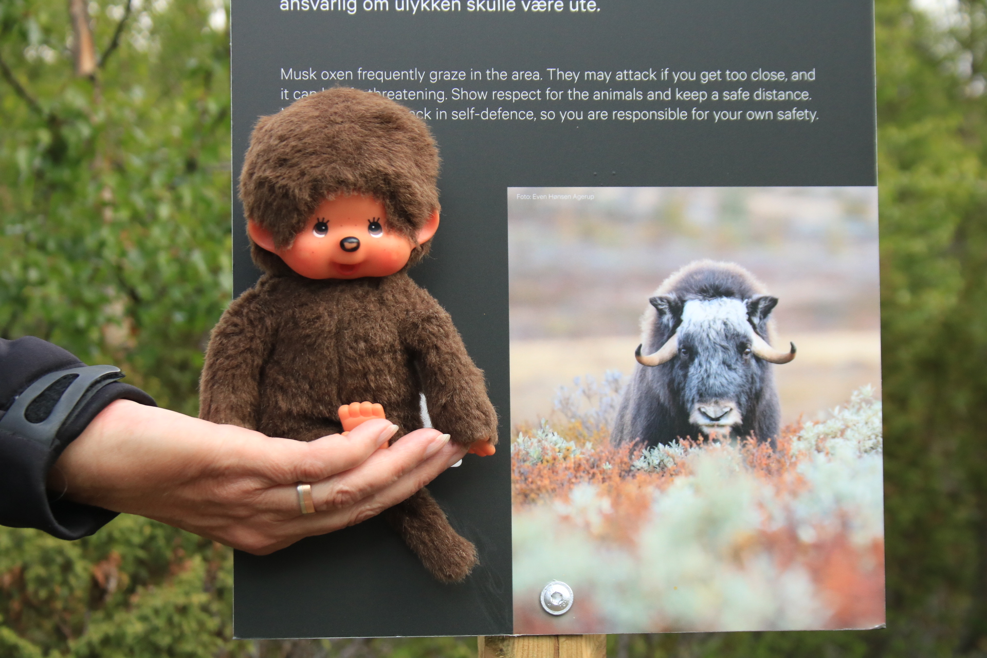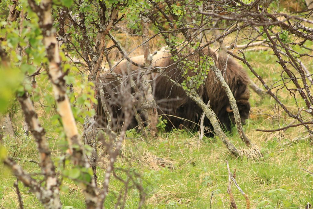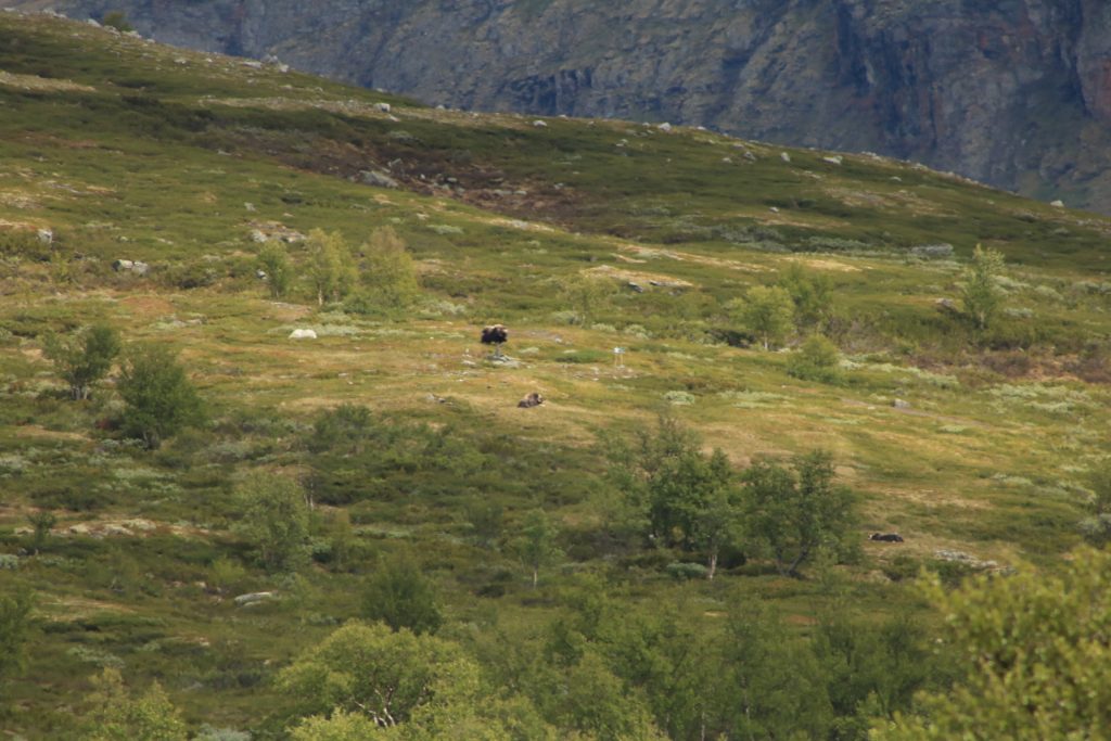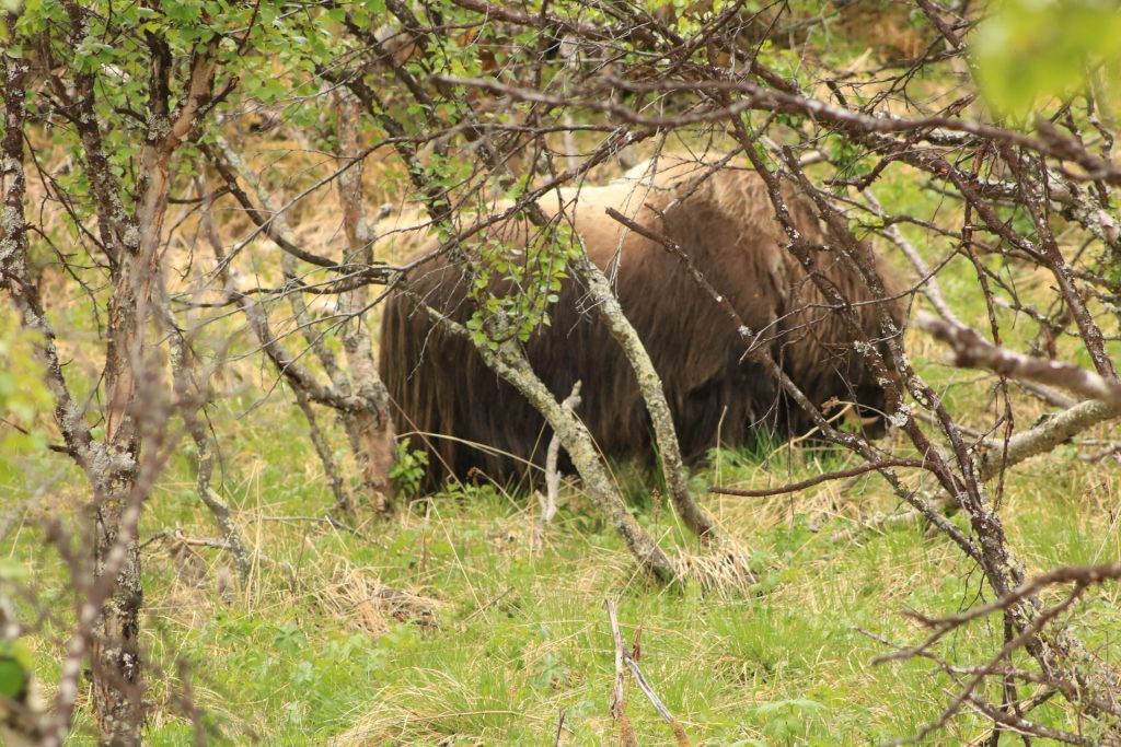 Also weiter Richtung Nationalpark. Am Parkplatz angekommen ging es sofort Richtung Wanderweg. Wir haben gedacht, wir laufen und laufen und sehen, werden wir nichts. Aber bereits nach 150 Meter Weg haben wir den ersten Moschusochsen gesehen. Es graste im Unterholz. Die Wanderstrecke war für mich als Flachlandtiroler, schon eine Herausforderung. Sie ging ca. 1000 Meter nur bergauf – zum Plateau. Aber ich bin ganz stolz, ich habe die Strecke gemeistert, ohne irgendwann zurückzuwollen. Als Belohnung gab es dann die absolute Krönung. Wir konnten noch mehr Moschusochsen bewundern. Sie waren zwar weit weg, aber dank Fernglas und Teleobjektiv konnten wir sie bewundern. Mein Gott, war das schön. Auch die Landschaft, die Pflanzen, traumhaft. Ein bisschen erinnerte uns das unsere Yukon Reise. Wir hätten näher ran gekonnt, aber das wäre eine Wanderung von ca. 2 Stunden einfach gewesen. Wir hätten einen weiten Bogen laufen müssen. Unser Maskottchen Minou war etwas zickig und beleidigt, weil es nicht auf dem Moschusochsen reiten durfte.