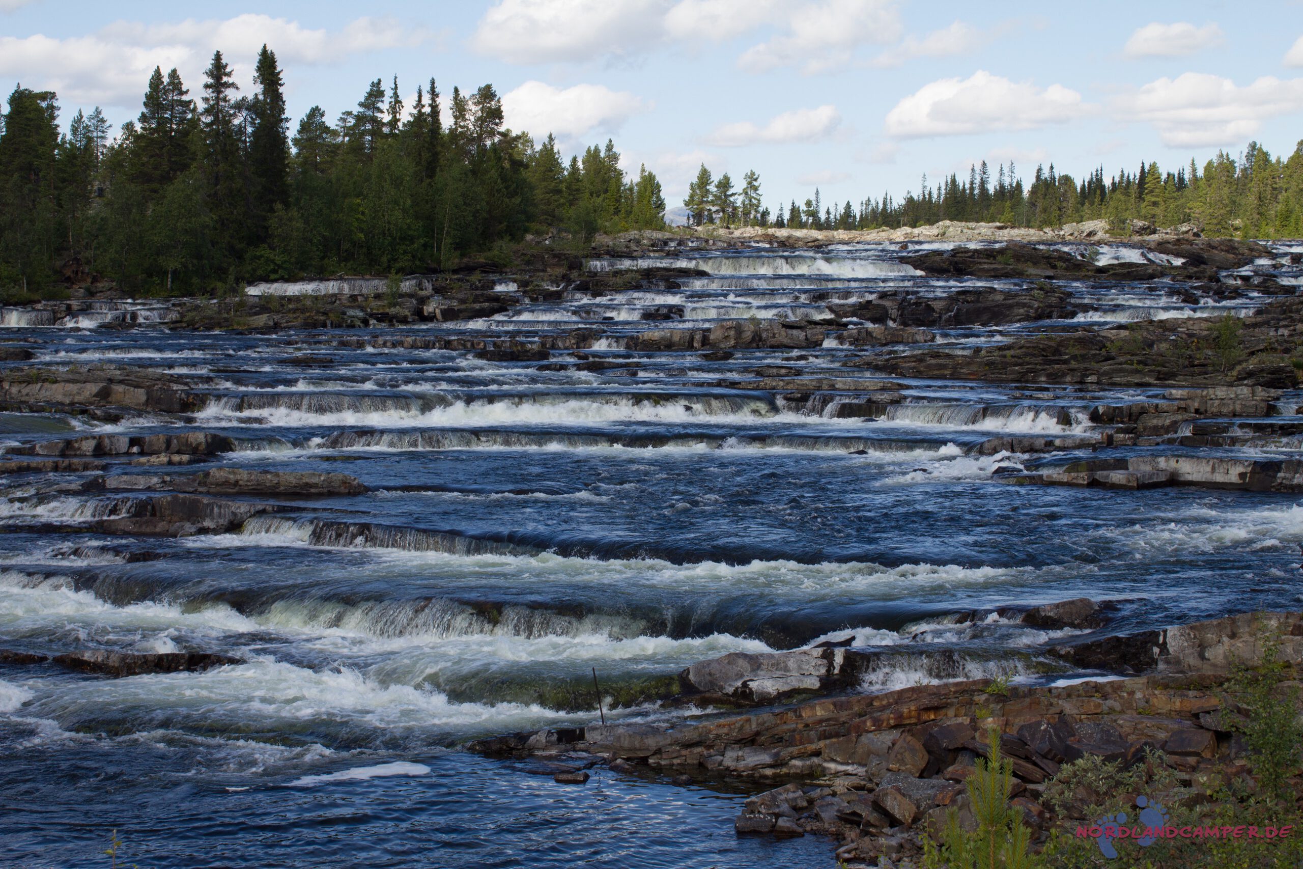 Ich weiß nicht wie viele Stopps wir eingelegt haben, aber es waren einige. Wir haben bei den Trappstegsforsen und am Dimforsen – zwei super schöne Wasserfälle. Unterwegs drückt ja auch mal das ein oder andere menschliche Bedürfnis. Dabei mussten wir dann feststellen, dass unsere Toilette blockiert. Super, eine Woche ohne irgendein Problemchen, wäre mal schön. Angekommen in Vilhelmina*, war ich erst vom Gewusel um mich rum erschlagen. Stundenlang sieht man mal ein Auto und eine Handvoll Menschen, und jetzt „Großstadt“ gewimmelt. Da es für uns aber keine Möglichkeit gab mit dem Gespann zu parken, sind wir dann auch schnell wieder verschwunden, bis zum Ortsausgang. Dort gibt es Bergmans Fisk & Vilt ein Landcafé mit Räucherei und Verkauf von regionalen Produkten. Erst haben wir uns einen Kaffee mit Pfannekuchen genehmigt. Die Pfannekuchen waren mit Käse gewürzt. Dazu gab es Erdbeermarmelade und Sahne. Hört sich seltsam an, war aber sehr lecker. Eingekauft haben wir dann noch einen Hartkäse (gibt es Skandinavien kaum) und einen, vor Ort hergestellten Camenbert, sowie dort geräucherte Rentier Salami und eingelegten Fisch. Jetzt aber Richtung Campingplatz, der diesmal in Storumans* liegt. Direkt im Centrum aber am See. Jetzt müssen wir hier erstmal sehen das wir unsere Toilette wieder hinbekommen.