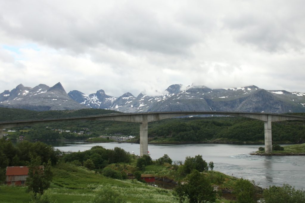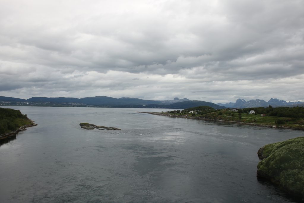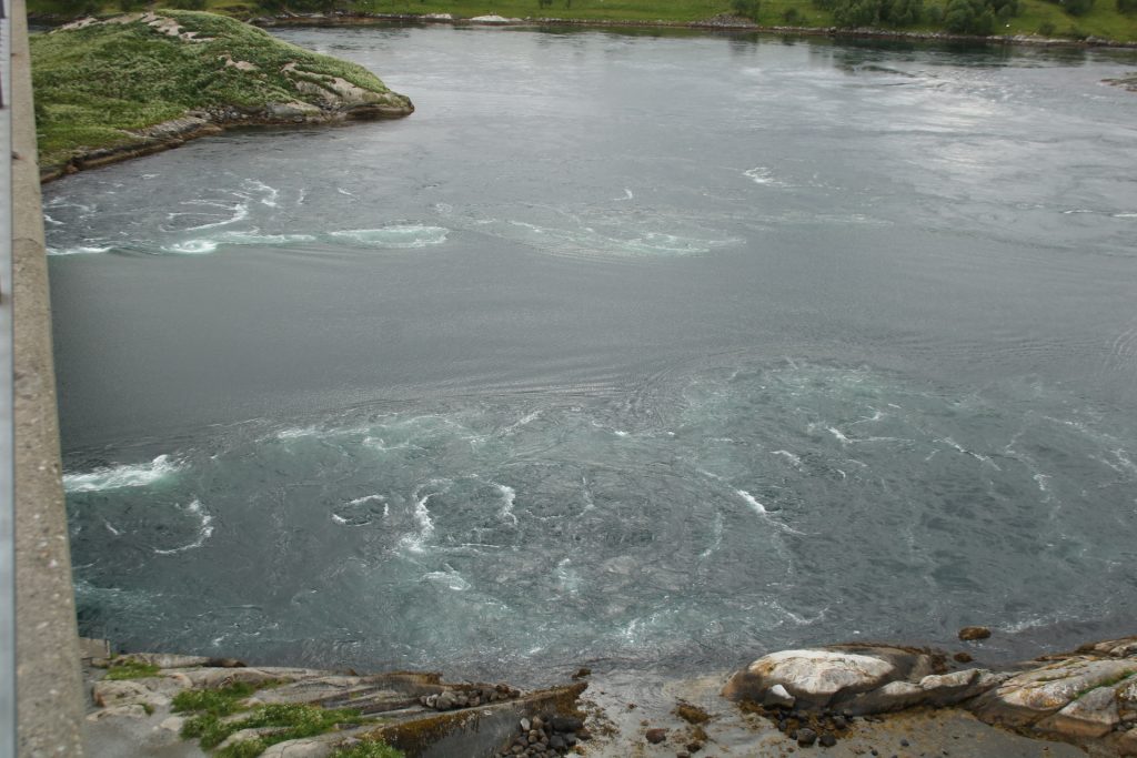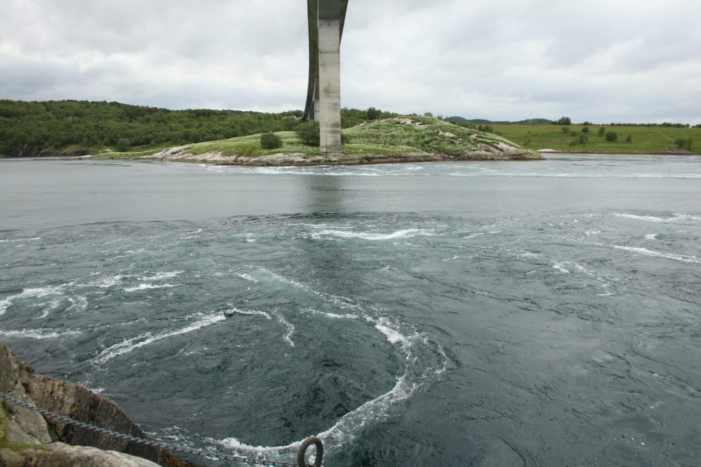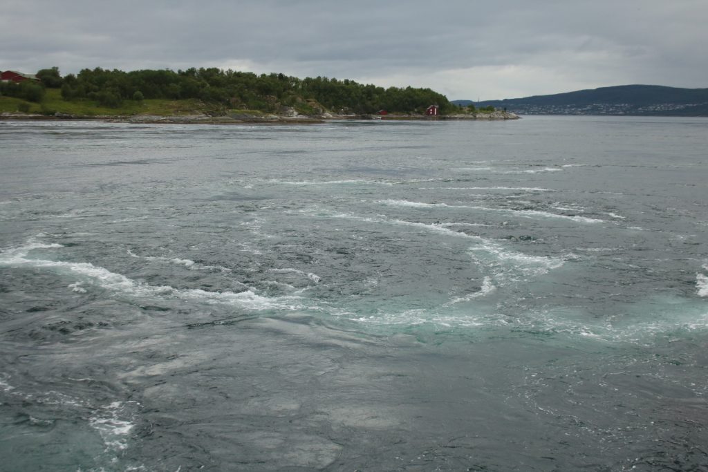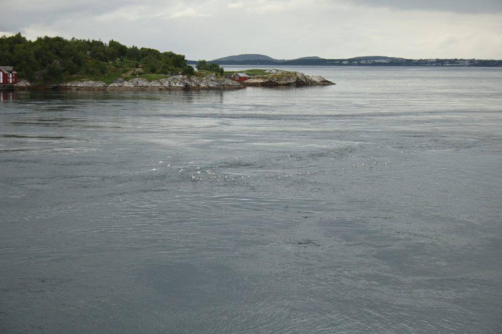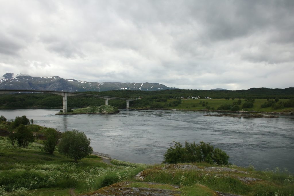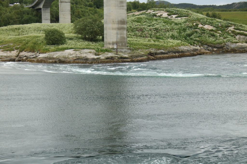 Denn heute Morgen ging es schon wieder weiter. Es hatte wieder die ganze Nacht geregnet, aber der Platz ist nicht versumpft. Der erste Teil heute war nur von Regen begleitet. Aber die Tour war trotzdem schön. Unser 1. Ziel – der Polarkreis -. Es war kalt, nur 5 Grad, regnerisch und windig. Aber wir sind ja keine Softeggs 😉. Der Parkplatz war voll mit Wohnmobilen und Gespannen. Ca.70% war deutsch. Es ist schon etwas besonderes dort zu stehen. Auch, wenn wir zum 2. Mal am nördlichen Polarkreis sind. Das erste Mal war es im Yukon zu genau der gleichen Zeit, zur Sonnenwende. Aber dort hatten wir statt 5 Grad 25 Grad. Nachdem wir uns auch den Andenkenshop angesehen haben (mein Gott, was die Leute da alles rausschleppen) ging es zum Etappenziel, nach Elvegard am Saltstraumen, ein Gezeiten Fluss. Kurz vor unserem Ziel wurden wir ausgebremst. Die Straßen waren gesperrt wegen der norwegischen Radfahrmeisterschaften. Die dauern bis Sonntag. Heute war Zeitfahren dran. Aber die Temperaturen hatten sich mal auf 15 Grad geschraubt, der Regen aufgehört, also kein Problem mal ein paar Dehnübung außerhalb des Autos zu machen. Ca. 20 Minuten mussten wir warten, das war erträglich. Einrichten und losmarschieren, wie wir es immer machen, nach der Fahrerei. Es sollte ein gemütlicher Spaziergang am Fluss entlang über die Brücke werden. Es wurde dann doch eine 3-stündige, stramme Wanderung. Unter der Brücke haben wir eine Möwen Brut Kolonie entdeckt. Die Jungen wurden fleißig gefüttert. Der Fluss ist mit seinen Strudeln unheimlich faszinierend. Auf der anderen Seite haben wir uns erstmal bei einem der Rennbetreuer erkundigt, wie morgen die Rennen geplant sind. Danach müssen wir uns richten, wenn wir hier einen Ausflug machen wollen. Dann runter an den Fluss, und wir hatte so ein Glück es war gerade der letzte und heftigste Teil des abfließenden Wassers. Das war unglaublich, zu sehen mit welcher Geschwindigkeit (ca. 40KM/H) der Fluss ins Meer fließt, und wie die Strudel sich permanent verändern. Hier gibt es einiges zu erforschen, aber wir bleiben auch für 3 Nächte haben also Zeit.