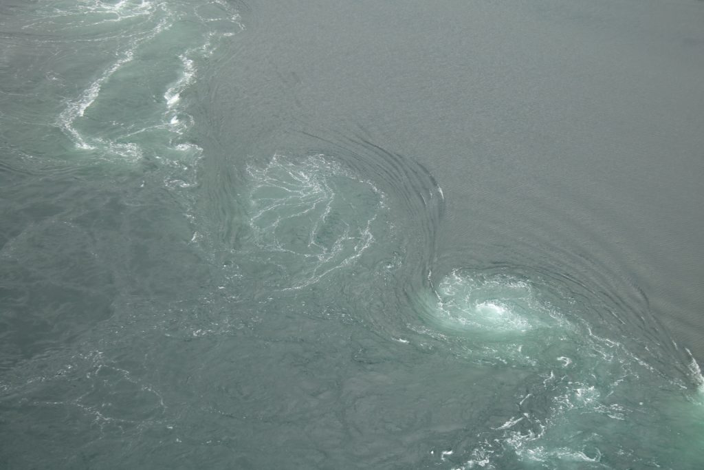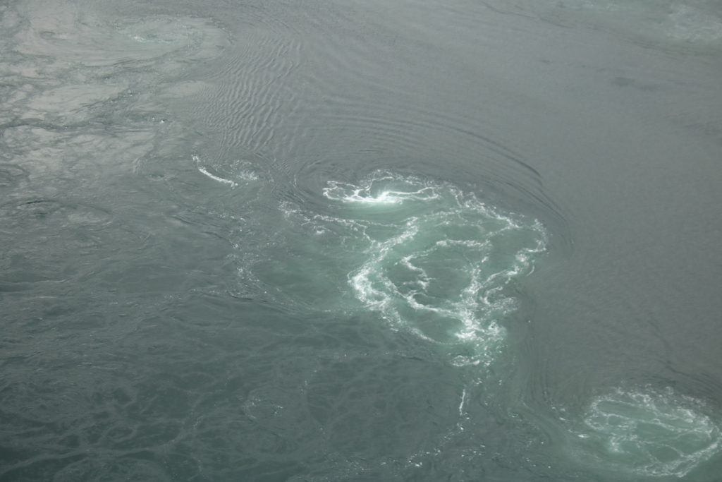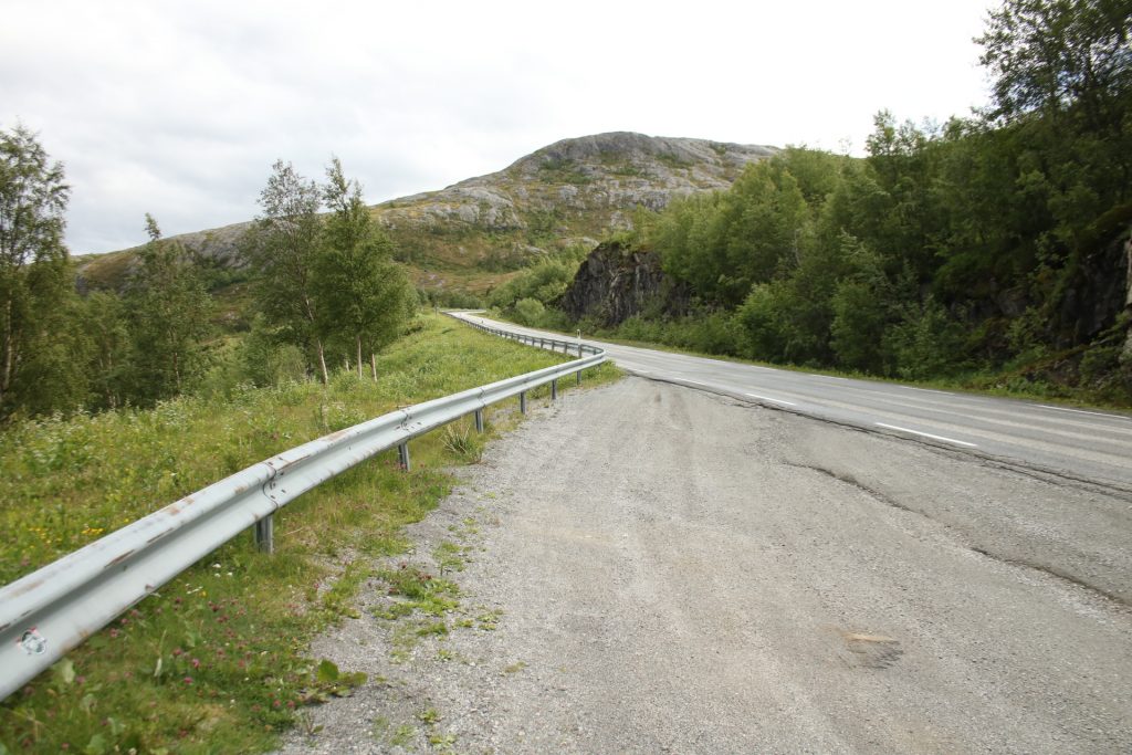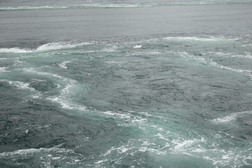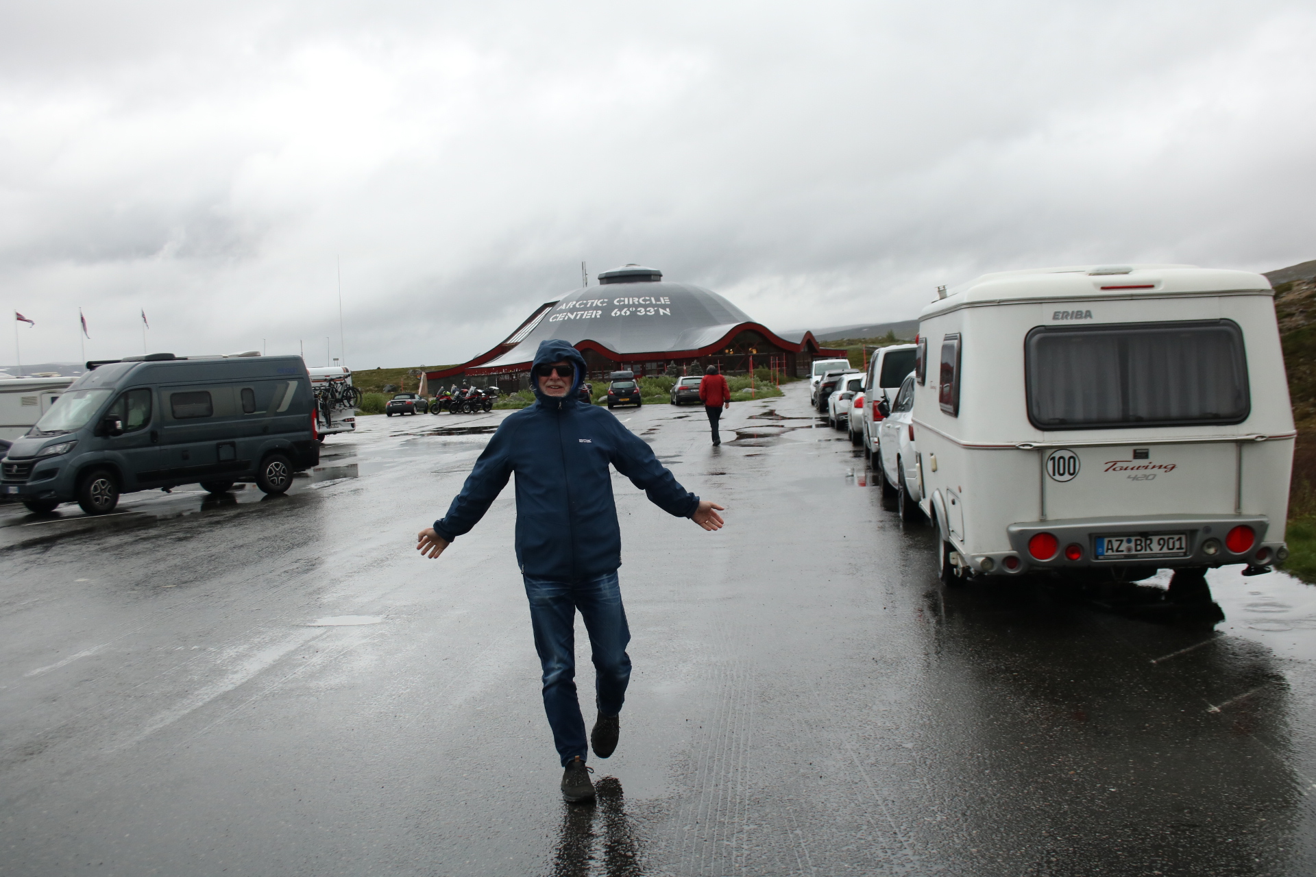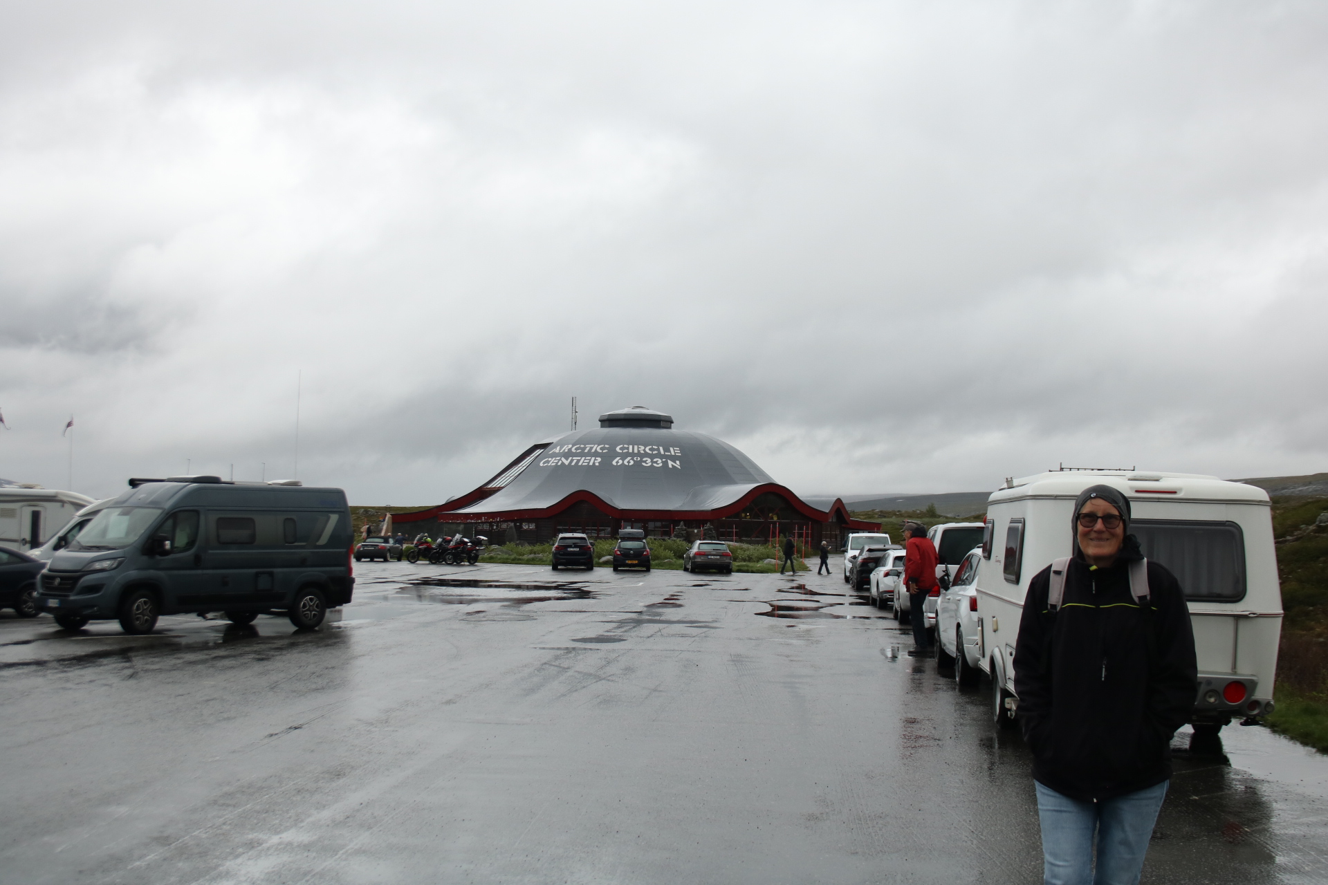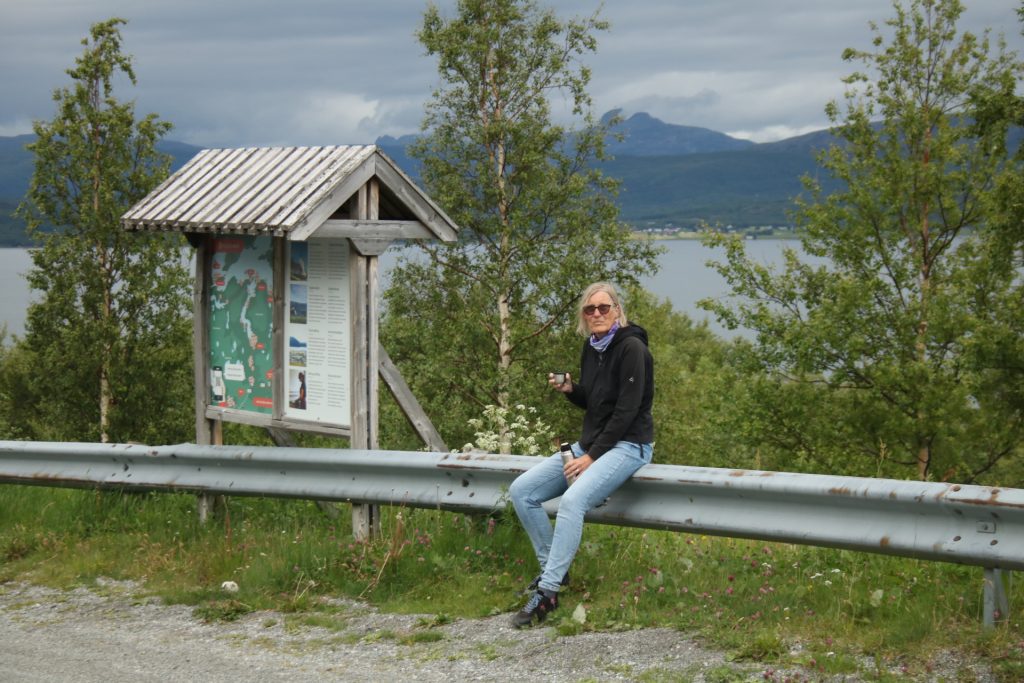 Denn heute Morgen ging es schon wieder weiter. Es hatte wieder die ganze Nacht geregnet, aber der Platz ist nicht versumpft. Der erste Teil heute war nur von Regen begleitet. Aber die Tour war trotzdem schön. Unser 1. Ziel – der Polarkreis -. Es war kalt, nur 5 Grad, regnerisch und windig. Aber wir sind ja keine Softeggs 😉. Der Parkplatz war voll mit Wohnmobilen und Gespannen. Ca.70% war deutsch. Es ist schon etwas besonderes dort zu stehen. Auch, wenn wir zum 2. Mal am nördlichen Polarkreis sind. Das erste Mal war es im Yukon zu genau der gleichen Zeit, zur Sonnenwende. Aber dort hatten wir statt 5 Grad 25 Grad. Nachdem wir uns auch den Andenkenshop angesehen haben (mein Gott, was die Leute da alles rausschleppen) ging es zum Etappenziel, nach Elvegard am Saltstraumen, ein Gezeiten Fluss. Kurz vor unserem Ziel wurden wir ausgebremst. Die Straßen waren gesperrt wegen der norwegischen Radfahrmeisterschaften. Die dauern bis Sonntag. Heute war Zeitfahren dran. Aber die Temperaturen hatten sich mal auf 15 Grad geschraubt, der Regen aufgehört, also kein Problem mal ein paar Dehnübung außerhalb des Autos zu machen. Ca. 20 Minuten mussten wir warten, das war erträglich. Einrichten und losmarschieren, wie wir es immer machen, nach der Fahrerei. Es sollte ein gemütlicher Spaziergang am Fluss entlang über die Brücke werden. Es wurde dann doch eine 3-stündige, stramme Wanderung. Unter der Brücke haben wir eine Möwen Brut Kolonie entdeckt. Die Jungen wurden fleißig gefüttert. Der Fluss ist mit seinen Strudeln unheimlich faszinierend. Auf der anderen Seite haben wir uns erstmal bei einem der Rennbetreuer erkundigt, wie morgen die Rennen geplant sind. Danach müssen wir uns richten, wenn wir hier einen Ausflug machen wollen. Dann runter an den Fluss, und wir hatte so ein Glück es war gerade der letzte und heftigste Teil des abfließenden Wassers. Das war unglaublich, zu sehen mit welcher Geschwindigkeit (ca. 40KM/H) der Fluss ins Meer fließt, und wie die Strudel sich permanent verändern. Hier gibt es einiges zu erforschen, aber wir bleiben auch für 3 Nächte haben also Zeit.