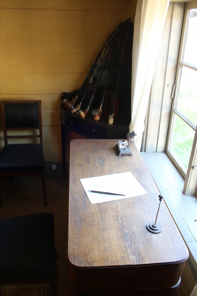 In der Uhrmacherei gab es sogar Uhren aus dem Schwarzwald von ca. 1700 und die Originalturmuhr aus Turku, die gerettet werden konnte. Ein Geigenbauer spielte eins seiner Instrumente. Der Schriftsetzer war fleißig, genauso wie die Dame von der Post. Hier konnte man Postkarten verschicken, die mit dem Original alten Stempel versehen werden. Da ich das nicht wollte, habe ich einen Stempeldruck so mitbekommen. Beim Fotografen konnte man alte Fotoplatten neben seiner ganzen Ausrüstung bewundern, und eine Dunkelkammer, die nicht größer war als eine große Fußmatte, da hätte ich Platzangst. Dann gibt es tatsächlich einen Tabak und Zigarren Hersteller. Finnland hat um 1840 angefangen selber Tabak anzubauen und Zigarren, Schnupftabak und Pfeifentabak herzustellen. Anfang 1900 kamen die Vorläufer der jetzigen Zigaretten dazu. Eine Ausstellung wunderschöner, dort auch hergestellter Pfeifen, lässt selbst mich strahlen. Die Herstellung von Ziegeln, das Weben, Nähen alles wurde hervorragend präsentiert. Nach über 2 Std. und ziemlicher Hitze, waren wir geschlaucht. So viele infos müssen erst einmal sacken. Jeder hat sich diesmal tatsächlich ein Andenken gekauft. Tim das Buch über Luostarinmäki – gab es leider nur in Englisch, aber ich werde es versuchen 😉, und ich ein paar Ohrring die in Turku gefertigt werden.